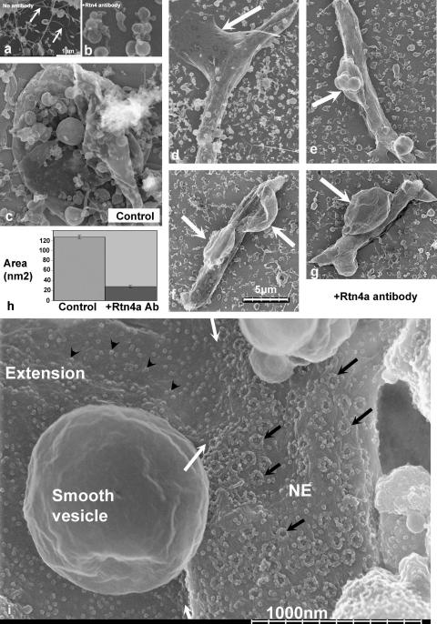 Fig. 7. Rtn4a antibody perturbs NE growth in Xenopus egg extract. The antibody prevents the usual formation of ER tubules (a, arrows), instead forming large vesicles (b). In control nuclear assembly reactions (c) nuclei are large and roughly round, whereas in the presence of the antibody they remain sperm shaped with large membrane extensions (arrows) (d–g). (h) Nuclear growth is significantly retarded by the Rtn4a antibody as shown by quantification of the two-dimensional area of nuclei observed by feiSEM. (i) High magnification image of nucleus assembled in the presence of Rtn4a antibody, showing NPCs (black arrows) assembled on the sperm chromatin shaped region and the NPC-free ER-like extension with ribosomes (arrowheads). White arrows indicate the junction between the chromatin bound NE and the ER-like extension. Scale bar in (a) applies to (a and b). Scale bar in (f) applies to (c–g).
