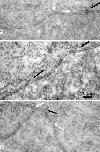 Fig. 4. Thin section TEM of NE with cytoplasmic membranes attached. Membranes may be continuous with the ONM (black arrows) or attached but apparently not continuous (white arrows).
