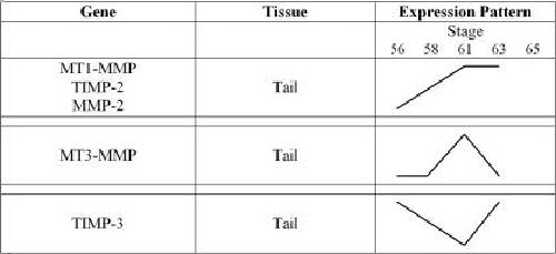 Figure 4. Patterns of MMP and TIMP RNA Levels Seen During X. laevis Tail Metamorphosis Derived From RT-PCR Data.Levels of RNA found during tail metamorphosis demonstrated that MT1-MMP, TIMP-2 and MMP-2 shared similar RNA expression patterns, peaking at stage 61 and staying elevated at stage 63. MT3-MMP and TIMP-3 expression patterns in the tail were not similar to the three other genes, nor to each other. Changes in RNA levels are not quantitative, but instead illustrate patterns of expression.
