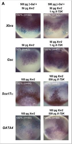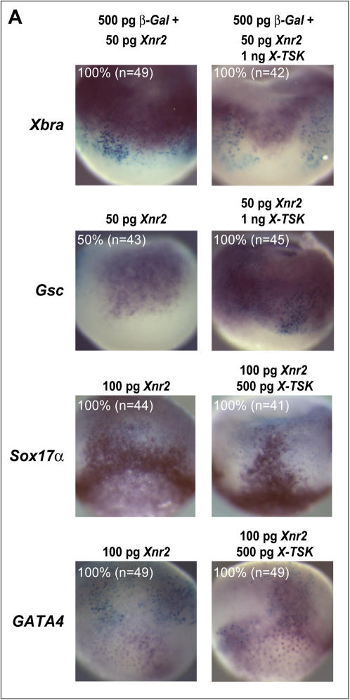 Figure 8. X-TSK changes local response to Xnr2.(A) Whole mount in situ hybridization of Xbra, Gsc (dorsal orientation) Sox17α and GATA4 in embryos injected with 500 pg β-Gal with 50 pg Xnr2, and 50 pg Xnr2 with 1ng X-TSK and 500 pg X-TSK, lateral orientation. Xbra expression is not detected in Xnr2-X-TSK expressing cells, as identified by β-Gal staining. Xnr2 mediated expansion of Gsc expression is enhanced by X-TSK. Expression of endoderm markers Sox17α and GATA4 expanded by Xnr2 is enhanced by X-TSK, suggesting that X-TSK changes local cellular response to Xnr2.
