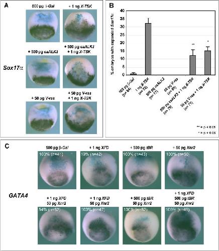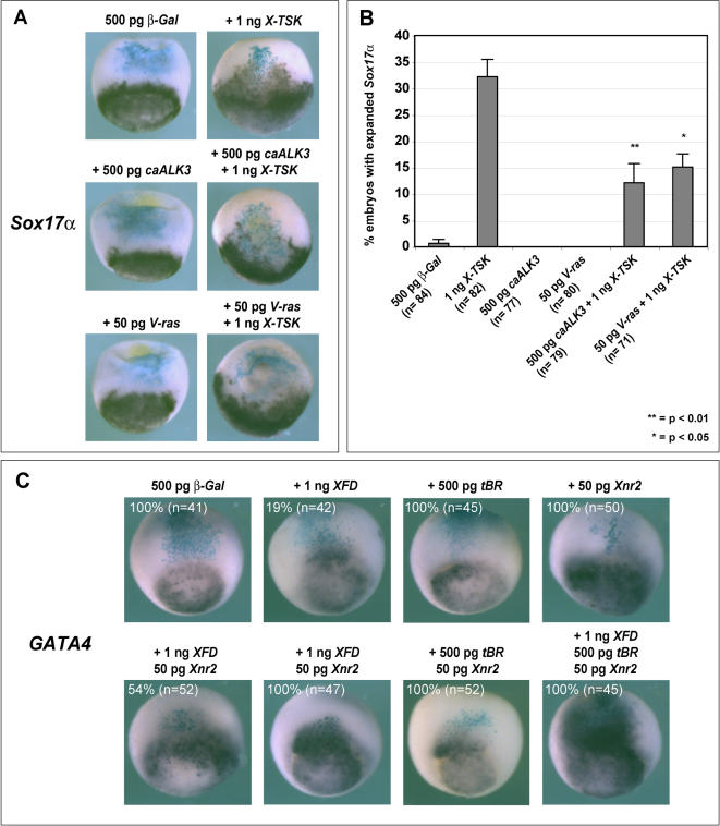 Figure 9. BMP and FGF signal activation blocks X-TSK mediated endoderm induction: triple signal regulation.(A) Whole mount in situ hybridization of Sox17α in embryos injected with 500 pg β-Gal with 1 ng X-TSK, 500 pg caALK3, 50 pg V-ras and 500 pg caALK3, 50 pg V-ras with 1 ng X-TSK, lateral orientation. (B) Graphic representation of quantity of embryos demonstrating expanded Sox17α expression. Introduction of caALK3 and V-ras partially blocks X-TSK expansion of Sox17α (p = 0.01 and 0.05 respectively). (C) Whole mount in situ hybridization of GATA4 in embryos injected with 500 pg β-Gal with combinations of 1 ng XFD, 500 pg tBR, and 50 pg Xnr2, lateral orientation. Demonstrated phenotype frequencies with n-numbers in white text. A triple combination of 1 ng XFD, 500 pg tBR, and 50 pg Xnr2 produces the strongest expansion of GATA4 expression.