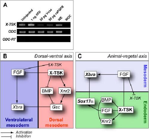 Figure 10. Transcriptional regulation of X-TSK and model of X-TSK function in germ layer formation and patterning.(A) Semi-quantitative RT-PCR of X-TSK expression in animal caps injected with 1 ng XFD, 50 pg V-ras or 50 pg caFGFR. WE = Whole embryo, WOC = Water only control. Inhibition of FGF signals with XFD enhances TSK expression, whereas activation of FGF signals with V-ras or caFGFR reduces TSK expression levels. (B) Model of TSK function in Xenopus germ layer formation and patterning: dorsal-ventral mesoderm patterning. X-TSK in dorsal mesoderm (red) inhibits BMP signaling to promote dorsal mesoderm formation, as marked by Gsc expression. This is possibly also enhanced through activation of Xnr2 signals by TSK. MAPK activation inhibits X-TSK expression in ventrolateral mesoderm, where X-TSK inhibits expression of ventrolateral mesoderm markers such as Xbra, through inhibition of FGF signaling. This network of signaling may contribute to clear patterning of the mesoderm. (C) Model of TSK function in endoderm formation. X-TSK coordinates inhibition of FGF and BMP signals with activation of Xnr2 signaling to induce endoderm formation (green), as marked by Sox17α. Again, X-TSK inhibits expression of ventrolateral mesoderm (blue) markers such as Xbra, through inhibition of FGF signaling and may contribute to the distinction between endoderm and mesoderm specific gene expression.