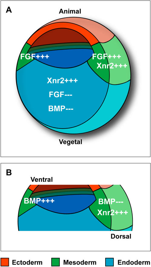 Figure 1. Signaling involved in Xenopus germ layer formation.(A) Selected signaling pathways involved in Xenopus mesoderm and endoderm formation. Activation of pathways indicated by ‘+++’, inhibition of pathways indicated by ‘−−−‘. Ectoderm = red, mesoderm = green, endoderm = blue. FGF signal activity is required for mesoderm formation in addition to activity of activin-like signaling (represented here by Xnr2). FGF and BMP signal inhibition with Xnr2 signal activation is involved in endoderm induction mechanisms. (B) Selected signaling pathways involved in Xenopus mesoderm patterning. Active BMP signaling produces mesoderm with ventral character, whereas inhibition of BMP signaling produces mesoderm of dorsal character. Also, Xnr2 expressed in the dorsal region has activity to induce dorsal mesoderm.