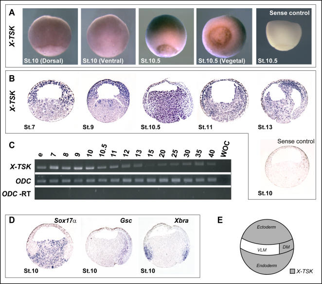 Figure 2. X-TSK expression in Xenopus.(A) Whole mount in situ hybridization of X-TSK in Xenopus gastrula stage embryos, including sense control. Purple staining indicates X-TSK expression. Orientations and stages as indicated. X-TSK is expressed in dorsal marginal zone (DMZ) and ectoderm from stage 10, and endoderm from stage 10.5. (B) In situ hybridization of X-TSK in sectioned Xenopus embryos, including sense control. Orientation: animal top, vegetal bottom, dorsal right, stages as indicated. X-TSK is expressed maternally (stage 7) in the animal region, with light staining in the vegetal region. From stage 10.5, X-TSK expression is detected throughout the endoderm. (C) Expression levels of X-TSK (upper panel) measured by RT-PCR from egg to stage 41, including ODC expression (middle panel) and -RT control (lower panel). WOC = Water Only Control. X-TSK is expressed at highest levels during germ layer formation and gastrulation. (D) Comparative expression of Sox17α (marking endoderm), Gsc (dorsal mesoderm), and Xbra (pan-mesoderm) in sectioned stage 10 embryos. (E) Schematic of X-TSK expression (grey) in ectoderm, dorsal mesoderm and endoderm.