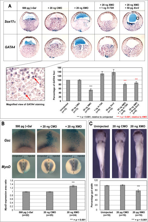 Figure 3. Loss of X-TSK function.(A) In situ hybridization of endoderm markers, Sox17α (upper row), and GATA4 (lower row) in sectioned early gastrula (stage 10) embryos, purple staining indicates expression. Orientation: animal top, vegetal bottom. All embryos injected with 500 pg β-Galactosidase (β-Gal) to identify targeted area (blue staining), with 20 ng control morpholino (CMO) or 20 ng X-TSK morpholino (XMO). Endoderm marker staining is reduced in XMO injected embryos, as indicated by general loss of purple staining (Sox17α) and loss of punctate staining (GATA4), detailed in the zoomed panel. Rescues were performed with 1 ng H-TSK, or 50 pg Xnr2, restoring endoderm marker expression. Detailed analysis of GATA4 staining in sectioned embryos. Numbers of GATA4 foci were counted, as represented graphically, relative to uninjected control. XMO injection reduces GATA4 foci by 50% (p = <0.001), partially rescued by 1 ng H-TSK and 50 pg Xnr2 to over 80% relative to control (p = <0.001). (B) Whole mount in situ hybridization of dorsal mesoderm marker, Gsc in stage 10.5 embryos (dorsal orientation) and MyoD in stage 16 (anterior top, posterior bottom) in embryos injected with 500 pg β-Gal, with 20 ng CMO or 20 ng XMO. Gsc expression is reduced in XMO injected embryos, whereas MyoD expression is expanded by 30% (relative to control, p = <0.001) on the injected side, as identified by blue β-Gal staining. (C) Gut morphology in stage 40 embryos injected with 20 ng CMO or 20 ng XMO. Gut width is reduced by 21% in XMO injected embryos, relative to uninjected embryos (p = <0.001).
