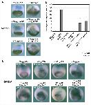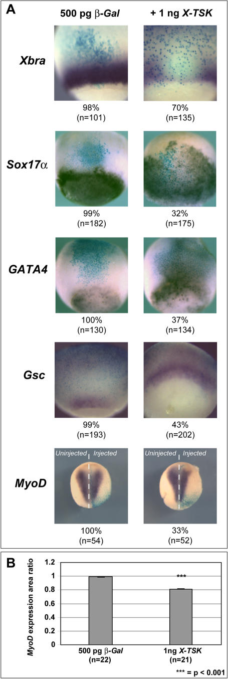 Figure 4. Gain of X-TSK function.(A) Whole mount in situ hybridization of germ layer markers in embryos injected with 500 pg β-Gal and 1 ng X-TSK, with percentage occurrence of demonstrated phenotype and ‘n’ numbers indicated below images. Xbra (pan-mesoderm) expression is inhibited and Sox17α and GATA4 (endoderm) expression is expanded, stage 10.5, lateral orientation. Gsc (dorsal mesoderm) expression is expanded, stage 10.5, dorsal orientation. MyoD expression is inhibited on the injected side, as identified by blue β-Gal staining, stage 16, anterior top, posterior bottom. (B) Graphical representation of MyoD expression in (A). MyoD expression is reduced by 20% on the injected side (p = <0.001).