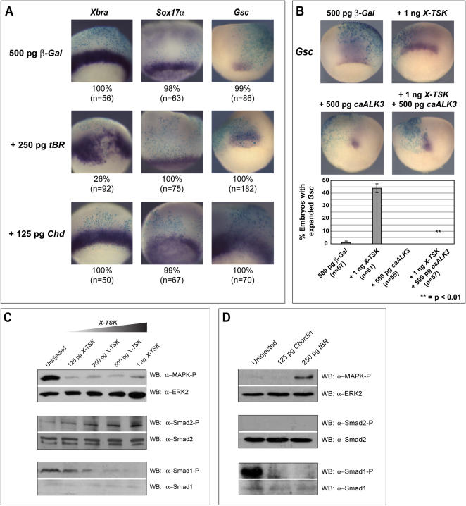 Figure 5. Mechanism of X-TSK function: signal analysis.(A) Whole mount in situ hybridization of germ layer markers in embryos injected with 500 pg β-Gal with 250 pg truncated BMP receptor (tBR) or 125 pg Chordin (Chd), with percentage occurance of demonstrated phenotype and ‘n’ numbers. Xbra and Sox17α phenotypes differ in comparison to X-TSK overexpression, whereas Gsc expression is commonly expanded. (B) Whole mount in situ hybridization of Gsc in embryos injected with 500 pg β-Gal with 1 ng X-TSK, 500 pg caALK3 and X-TSK with caALK3, dorsal orientation. caALK3 blocks X-TSK mediated expansion of Gsc expression. (C) Western blotting of MAPK and Smad1 phosphorylation in animal caps and Smad2 phosphorylation in DMZ explants, with total MAPK, Smad2 and Smad1 controls in explants injected with X-TSK (125 pg-1 ng) (D) 125 pg Chd or 250 pg tBR. X-TSK inhibits MAPK and BMP phosphorylation in animal caps whilst activating Smad2 phosphorylation in DMZ. Chd and tBR similarly inhibit BMP phosphorylation, but contrast with X-TSK in MAPK and Smad2 phosphorylation status.