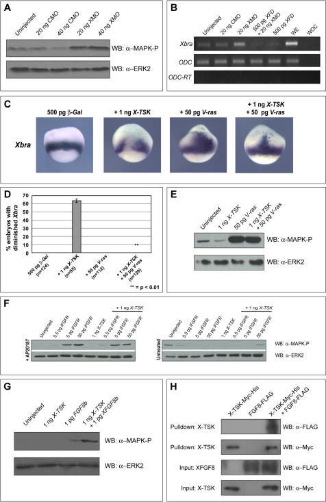 Figure 6. X-TSK inhibition and binding of FGF8b.(A) Western blotting of MAPK phosphorylation in animal caps injected with 20–40 ng CMO and 20–40 ng XMO. Depletion of X-TSK with XMO activates MAPK phosphorylation. (B) Semi-quantitative RT-PCR of Xbra expression in DMZ injected with 20 ng CMO, 20 ng XMO, 500 pg XFD and 500 pg XFD with 20 ng XMO. WE = Whole embryo, WOC = Water only control. Inhibition of FGF signals with XFD blocks Xbra expression activated upon depletion of X-TSK with XMO. (C) Whole mount in situ hybridization of Xbra in stage 10.5 embryos, lateral orientation. Embryos injected with 500 pg β-Gal with 1 ng X-TSK, 50 pg V-ras and X-TSK with V-ras. V-ras blocks X-TSK mediated inhibition of Xbra expression in 100% of embryos analyzed (p = <0.01), represented graphically in (D). (E) Western blotting of MAPK phosphorylation in animal caps injected with X-TSK and V-ras. V-ras blocks X-TSK mediated inhibition of MAPK phosphorylation. (F) Western blotting of MAPK phosphorylation in animal caps injected with X-TSK and iFGFR, in the presence or absence of chemical dimerisation agent, AP20187. Induced dimerisation blocks the activity of X-TSK to inhibit MAPK phosphorylation. (G) Western blotting of MAPK phosphorylation in animal caps injected with X-TSK and FGF8b. X-TSK inhibits MAPK phosphorylation activated by FGF8b. (H) Western blotting of nickel bead pulldown of FGF8b-FLAG in complex with X-TSK-Myc-His. Top panel: detection of FGF8b-FLAG in complex with X-TSK-Myc-His (third lane). Second panel: detection of X-TSK-Myc-His pulled down. Third and bottom panels: detection of FGF8b-FLAG and X-TSK-Myc-His input into the pulldown reaction.