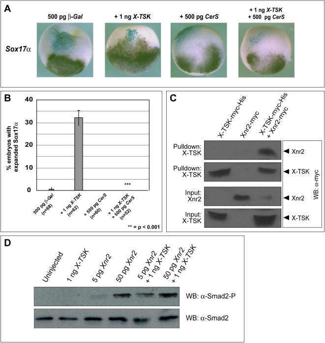 Figure 7. X-TSK requires intact Xnr signaling for endoderm induction; X-TSK binds to and enhances Xnr2 Signaling.(A) Whole mount in situ hybridization of Sox17α in embryos injected with 500 pg β-Gal with 1 ng X-TSK, 500 pg CerS and 500 pg CerS with 1 ng X-TSK, lateral orientation. (B) Introduction of CerS blocks X-TSK expansion of Sox17α in 100% of embryos analyzed (p = <0.001). (C) Western blotting of nickel bead pulldown of Xnr2-Myc in complex with X-TSK-Myc-His. Top panel: detection of Xnr2-Myc in complex with X-TSK-Myc-His (third lane). Second panel: detection of X-TSK-Myc-His pulled down. Third and bottom panels: detection of Xnr2-Myc and X-TSK-Myc-His input into the pulldown reaction. (D) Western blotting of Smad2 phosphorylation in animal caps injected with 1 ng X-TSK, 5 pg and 50 pg Xnr2. X-TSK enhances Smad2 phosphorylation, particularly evident with 5 pg Xnr2.