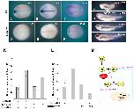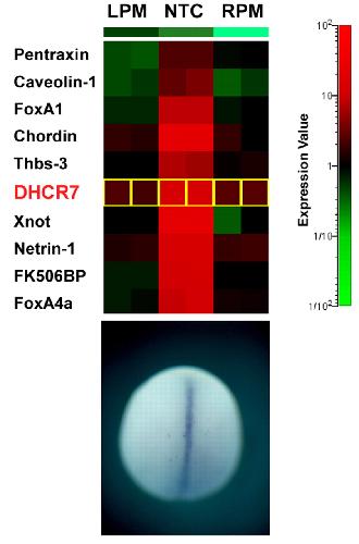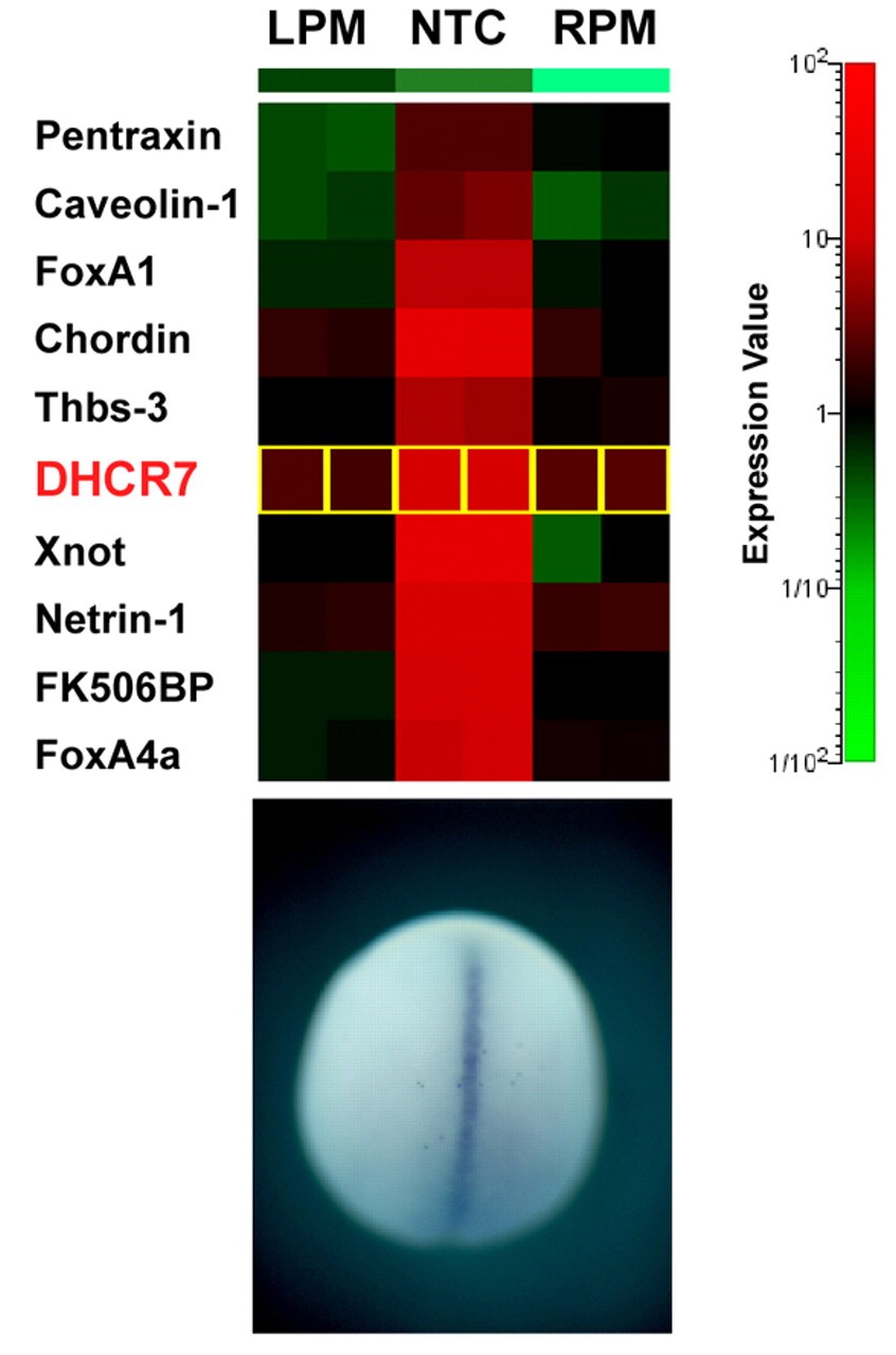 Fig. 1. Expression of DHCR7 in developing notochord. (Top) Hierarchical clustering analysis of microarray data. Each column represents a single hybridization and each row a single clone. The colors ranging from red to green correspond to increased and decreased gene expression. LPM, left presomitic mesoderm; NTC, notochord; RPM, right presomitic mesoderm. (Bottom) Whole-mount in situ hybridization revealing the expression of DHCR7 in the midline of a Xenopus neurula stage embryo.