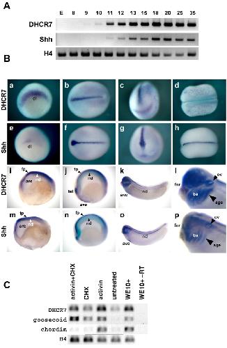 Fig. 2. Developmental expression profiles of DHCR7 and Shh. (A) RT-PCR analysis of DHCR7 and Shh expression during Xenopus development. H4, histone H4. (B) Whole-mount in situ hybridization of DHCR7 and Shh at gastrula (a,e), neurula (b-d,f-h,i,j,m,n), tadpole (k,l,o,p) stages. (a,b,d,e,f,h) Dorsal views. (c,g) Anterior views. (i-p) Lateral views with anterior towards the left and dorsal upwards. dl, dorsal lip; fp, floor plate; arc, archenteron; tel, telencephalon; ave, anterior ventral endoderm; ba, branchial arches; fnr, frontonasal region; age, presumptive anterior gut endoderm; nd, notochord; ov, otic vesicle. (C) Induction of DHCR7 by activin in animal cap explants. CHX, cycloheximide; WE, whole embryos.
