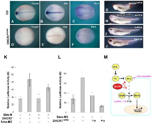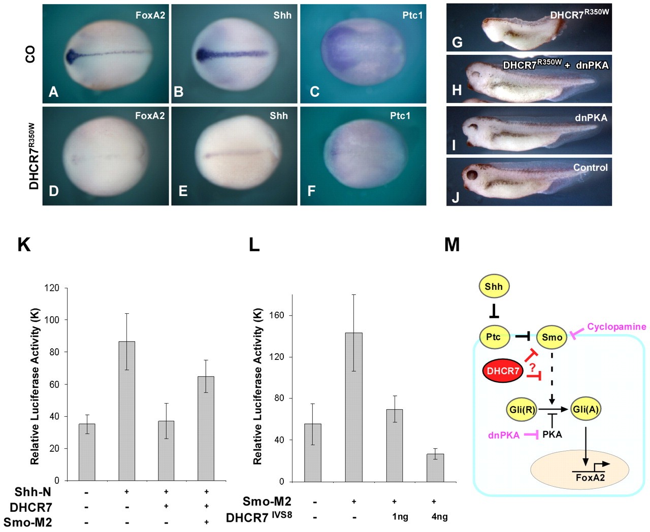 Fig. 8. The effects of DHCR7 impinges on Smo. (A-F) Microinjection of DHCR7R350W mutant inhibits endogenous Shh signaling. Embryos microinjected with 1 ng of DHCR7R350W mRNA inhibits the expression of FoxA2, Shh and Ptc-1. (G-I) Microinjection of mRNA (500 pg) encoding dnPKA inhibits the cyclopic phenotype caused by DHCR7R350W. (J) Control uninjected embryo. (K) Smo-M2 rescues DHCR7-mediated Hh signaling inhibition. Embryos were co-injected with 8Ã3â²Gli-BS Luc together with Chordin, Shh-N, DHCR7 or Smo-M2 mRNA (0.5 ng), or in combination, and the reporter gene activity was measured. (L) DHCR7IVS8-1G>C blocks Gli reporter activation mediated by Smo-M2. Embryos were co-injected with Gli reporter together with Chordin, DHCR7IVS8-1G>C or Smo-M2 mRNA, or in combination, and reporter gene activity was measured. (M) Model for the role of DHCR7 in Shh signaling. Shh inactivates Ptc, thus permitting the activation of Smo. Activated Smo transmits a Shh signal to activate Gli protein. PKA inhibits Gli activation. DHCR7 inhibits Shh signaling either at the level of or downstream of Smo.