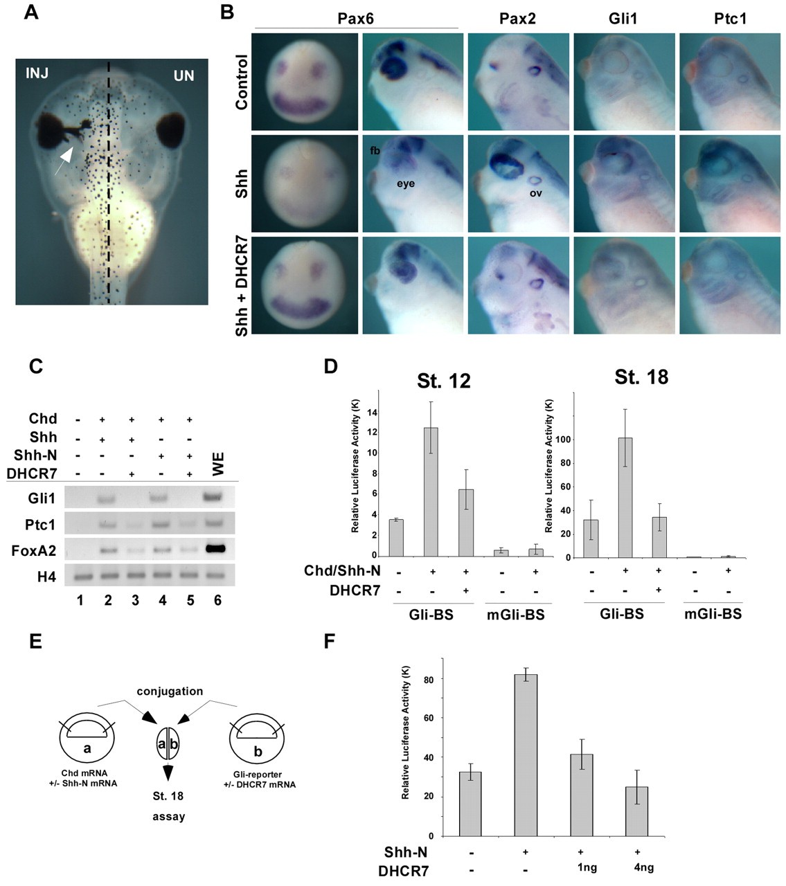 Fig. 3. Inhibition of Shh signaling by DHCR7. (A) DHCR7 mRNA (2 ng) was microinjected unilaterally into one blastomere of the two-cell stage embryo. (B) Two-cell stage embryos were injected with 250 pg of Xenopus Shh mRNA (middle row), or together with 500 pg of DHCR7 mRNA (bottom row; Shh + DHCR7). Embryos were subjected to whole mount in situ hybridization at stage 35 (tailbud) using indicated probes. When Shh mRNA was co-injected with DHCR7 mRNA, marker gene expression was restored to the wild-type level (top row). The rescue efficiency was: Pax6, 87% (n=46); Pax2, 90% (n=48); Gli1, 91% (n=34); Patched1, 93% (n=28). (C) RT-PCR analysis of RNA isolated from animals caps injected with Chordin (50 pg) plus Shh (100 pg) (lane 2), Chordin plus Shh with 1 ng of DHCR7 (lane 3), Chordin plus 100 pg of Shh-N (lane 4) and Chordin plus Shh-N with 1 ng of DHCR7 (lane 7) mRNA. Uninjected stage 28 equivalent animal cap control (lane 1). (D) Gli-reporter assays using animal cap assay. (E) Schema of a conjugation experiment. (F) Gli-reporter gene assay using animal cap conjugates.
