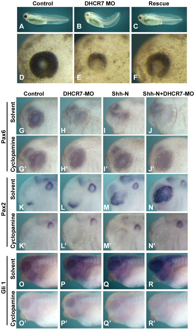 Fig. 4. Loss-of-DHCR7 affects cellular response toward Hh signaling in optic vesicle. (A-F) DHCR7 knockdown by MOs leads to eye defects. Four-cell stage Xenopus embryos were injected marginally in all four blastomeres with 5 ng of control MO (A,D), DHCR7 MOs (B,E) or DHCR7 MOs together with 125 pg of full-length DHCR7 rescue mRNA (C,F). Additional defects detected were in the heart and gut of the swimming tadpole stages (data not shown). (G-R) Loss of DHCR7 affects cellular response towards Hh signaling. Four-cell stage Xenopus embryos were injected with 20 ng of control MO (G,Gâ²,K,Kâ²,O,Oâ²), 20ng of DHCR7 MOs alone (H,Hâ²,L,Lâ²,P,Pâ²), 50 pg of Shh-N mRNA alone (I,Iâ²,M,Mâ²,Q,Qâ²) or 20 ng of DHCR7 MOs with 50 pg of Shh-N mRNA (J,Jâ²,N,Nâ²,R,Râ²). Knockdown of DHCR7 reduces Pax6 expression (G-J), expands the expression of Pax2 expression (K-N) and upregulates Gli1 expression (O-R). (Gâ²-Râ²) Continuously treatment of embryos with cyclopamine (100μ M) from the blastula stage blocks Hh signaling (G-J,K-N,O-R). Circled areas mark optic vesicles.