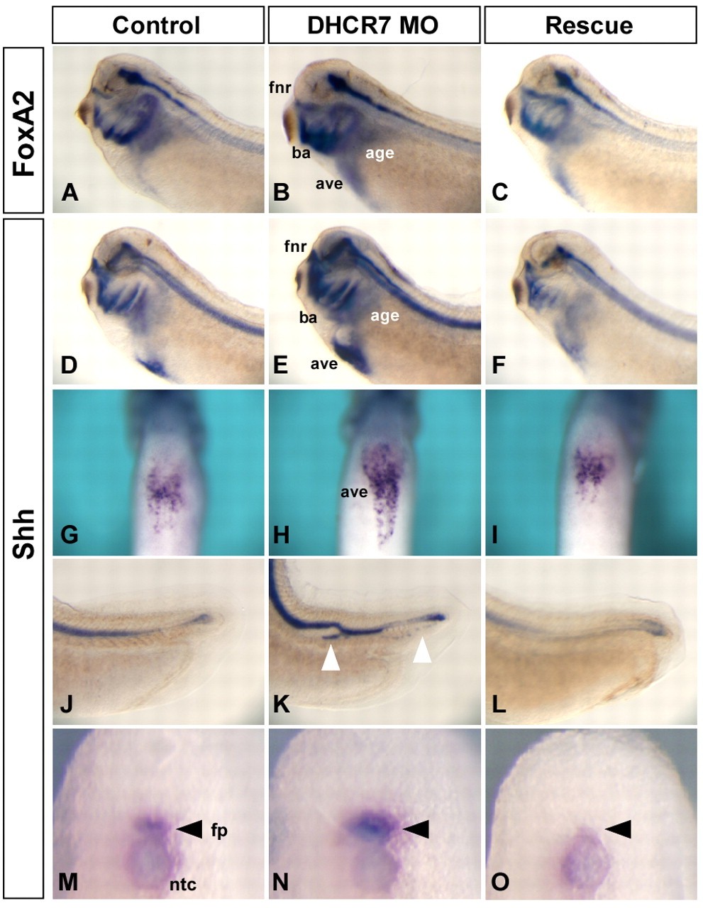 Fig. 5. Expansion of Shh and FoxA2 expressing domains in MO-injected embryos. Four-cell stage Xenopus embryos were injected with 20 ng of control MO (A,D,G,J,M), with 20 ng of DHCR7 MOs alone (B,E,H,K,N) or with 500 pg of DHCR7 rescue mRNA (C,F,I,L,O). Whole-mount in situ hybridization of the tailbud stage embryos microinjected with DHCR7-MOs shows expansion of floor plate as marked by FoxA2 (A-C) and Shh (D-O) expression. (B,E) DHCR7 MOs injected embryos expand FoxA2 and Shh expression domains in frontal nasal region, branchial arches and anterior gut endoderm. (M-O) Transverse sections of embryos indicated in D,E. (K) Ectopic expression of Shh was detected in the notochord region of DHCR7 MO injected embryos (40%, n=28). ave, anterior ventral endoderm; ba, branchial arches; fl, floor plate (arrowheads); fnr, frontonasal region; age, presumptive anterior gut endoderm. White arrowheads indicate ectopic Shh expression.