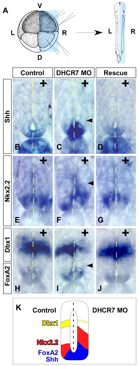 Fig. 6. Neural patterning modulated by DHCR7. (A) Schema of unilateral injection experiment. Eight-cell stage Xenopus embryos were unilaterally (right side) microinjected with 20 ng of control MO (B,E,H) or 20ng of DHCR7 MOs alone (C,F,I) or with 500 pg of DHCR7 rescue mRNA (D,G,J). Transverse section of whole-mount in situ hybridization of the tailbud stage embryos microinjected with DHCR7-MOs shows ventralization of neural tube as marked by Shh (B-D), Nkx2.2 (E-G), FoxA2 and Dbx1 (H-J) expression. Arrowheads indicate the dorsal expression limit of the indicated markers. (K) Summary of ventralization of neural tube by loss of DHCR7.