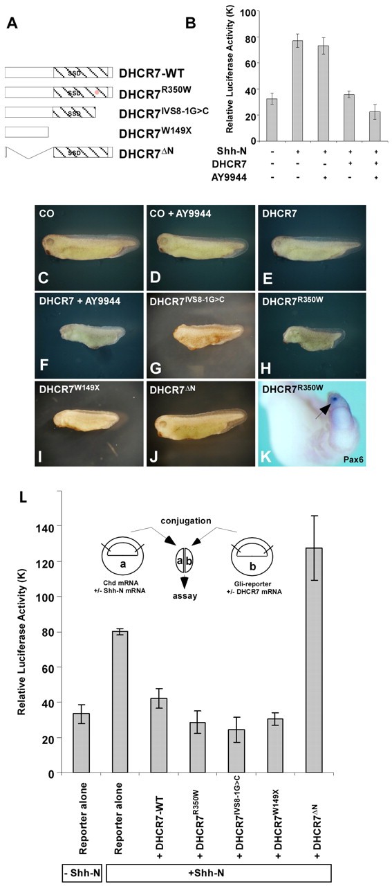Fig. 7. Shh signaling and cholesterol synthesis. (A) Various DHCR7 mutant constructs. (B) Inhibition Hh signaling is enhanced by treatment with AY-9944. Embryos were injected with the reporter construct 8X3â²Gli-BS Luc with or without Shh-N, DHCR7 mRNA and treatment with 10 μM AY-9944. (C-J) Microinjection of DHCR7 mutants that are defective in reductase activity causes cyclopic phenotypes. The overexpression of DHCR7 mRNA (E) or treatment with AY-9944 (D) caused minor defects, but a combination of both causes severe defects (F). Embryonic phenotypes caused by microinjection of 1 ng of DHCR7R350W (H), DHCR7IVS8-1G>C (G), DHCR7δN (J) and DHCR7W149X (I) mutants. (K) Pax6 staining of tailbud stage embryos injected with DHCR7R350W. Arrow marks `cyclopic' eye. (L) Modulation of Gli reporter by DHCR7 mutants using animal cap conjugation. Embryos were injected with Chordin (with or without Shh-N mRNA) or with Gli-BS Luc (with or without DHCR7 mRNA).