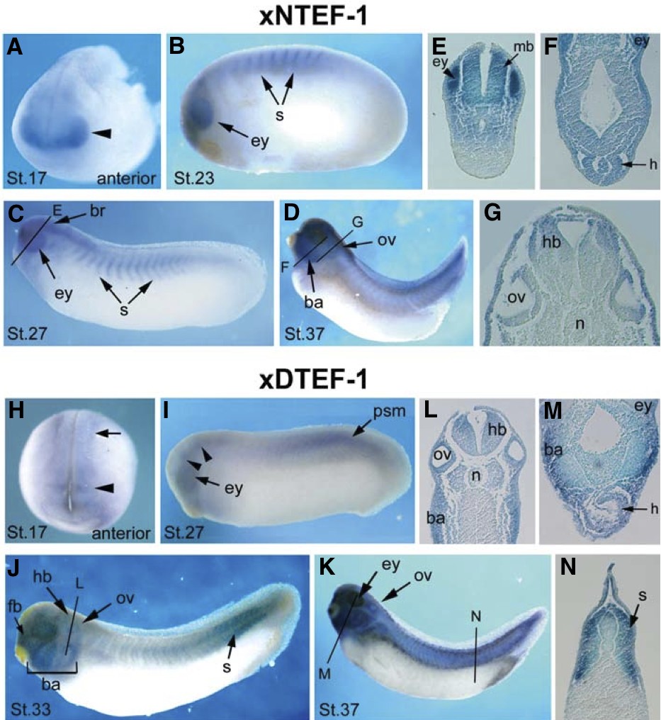Whole mount in situ hybridization was performed on embryos at various developmental stages to determine the expression pattern of XNTEF-1 (A-G) and XDTEF-1 (H-N) genes. (A) In stage 17 embryo, XNTEF-1 mRNA is localized in the anterior region of the neural plate covering the eye field (arrowhead). (B) In stage 23 embryo, the expression is found in the eye (ey) and the trunksomites (s). (C) In stage 27 embryo, XNTEF-1 is strongly expressed in the brain (br), the eye (ey) and the trunksomites (s). Black line indicates the position of the section shown in (E). (D) In stage 37 embryo, XNTEF-1 is expressed in the brain, the headmesenchyme, the branchial arches (ba) and the otic vesicle (ov). There is also a widespread expression in the trunk and the posterior region. Black lines indicate the position of the sections shown in (F,G). (E) Transverse section of stage 27 embryo showing XNTEF1 expression in the ventricular zone of the midbrain (mb) and in the eye (ey). (F) Transverse section in the anterior region of stage 37 embryo showed expression in the eye (ey) and in the embryonic heart (h). (G) In transverse section of stage 37 embryo, the staining is present in the hindbrain (hb) and the otic vesicle (ov) but absent from notochord (n). (H) In stage 17 embryo, XDTEF-1 is expressed in midbrain (arrowhead) and paraxial domain (arrow). (I) In stage 27 embryo, the expression is detected in the midbrain and hindbrain regions (arrowheads), the eye (ey), the posteriorsomites and the presomitic mesoderm (psm). (J) In stage 33 embryo, the staining marks predominantly the forebrain (fb), the eye, the branchial arches (ba), the otic vesicle (ov) and the posteriorsomites (s). Black line indicates the position of the section shown in (L). (K) In stage 37 embryo, XDTEF-1 expression is found in the brain, headmesenchyme, otic vesicle (ov), trunk and posterior regions. Black lines indicate the position of the sections shown in (M,N). (L) Transverse section in the head region of stage 33 embryo showed expression in the hindbrain (hb), the otic vesicle (ov) and the branchial arches (ba). (M) Transverse section in the anterior region of stage 37 embryo showed expression in eye (ey), branchial arches (ba) and embryonic heart (h). (N) Transverse section in posterior region of stage 37 embryo showed expression in the somites (s).