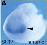 tead4 (TEA domain family member 4) gene expression in Xenopus laevis embryo via in situ hybridization, NF stage 17, anterior view, dorsal up.