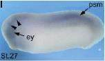 tead1 (TEA domain family member 1 {SV40 transcriptional enhancer factor}) gene expression in Xenopus laevis embryo, assayed via in situ hybridization, NF stage 27, lateral view, dorsal up, anteriorleft.