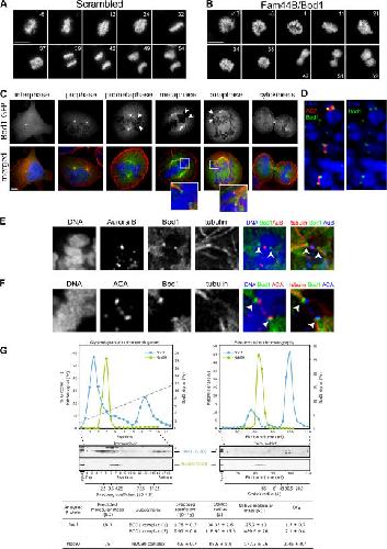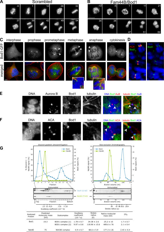 Figure 1. Bod1 is a novel protein localizing to centrosomes and kinetochores. (A and B) Selected maximum intensity projections from time-lapse images of HeLa cells show gene-specific mitotic phenotypes. Cells were transfected with the pU6YH plasmid expressing scrambled shRNA (A) or shRNA targeting Bod1 (B). Images were taken 60 h after transfection over a period of 60–120 min. Numbers indicate time (minutes) from the establishment of a metaphase plate. (C) HeLa cells transfected with Bod1-GFP were fixed after 48 h with PFA. (top) Localization of Bod1-GFP at various points in the cell cycle. (bottom) A merged image with microtubules (red), chromosomes (blue), and Bod1-GFP (green). Arrowheads indicate concentrations of Bod1-GFP at microtubule ends. Insets are magnified images of boxed areas. (D) Chromosome spreads of nocodazole-arrested HeLa cells stained for endogenous Bod1 (green), ACA (red), and DNA (blue). (E and F) The localization of Bod1-GFP was determined with respect to Aurora B (E) and ACA (F). Kinetochore localization of Bod1-GFP is indicated by arrowheads. (G) Hydrodynamic analysis of nocodazole-arrested HeLa lysates by glycerol gradient centrifugation (left) and size exclusion chromatography (right) showing that Bod1 is present in two different complexes. Asterisks mark cross-reacting bands. Bars, (A and B), 10 μm; (C), 5 μm.