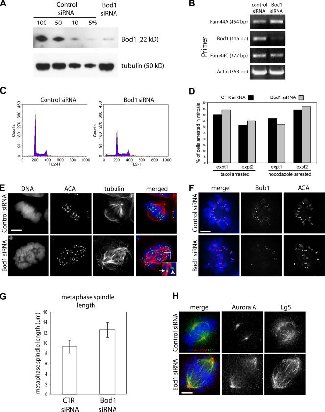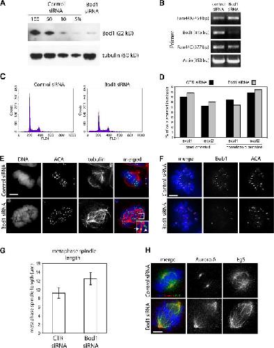 Figure 2. Depletion of Bod1 by siRNA causes major chromosome alignment defects. (A) Immunoblot using an anti-Bod1 antibody showing the effective depletion of Bod1 72 h after transfection of siRNA duplexes. Tubulin was used as a loading control. (B) One-step RT-PCR analysis of control and Bod1 siRNA RNA lysates showing the specific knockdown of Bod1 in relation to other Fam44 family members. (C) FACS analysis of control and Bod1-depleted cells. (D) Taxol or nocodazole was added to control or Bod1 siRNA cells 48 h after transfection, and the percentage of mitotic cells was determined 18 h later. (E) HeLa cells were transfected with control siRNA or siRNA against Bod1 and processed for immunofluorescence 72 h later. Microtubules are shown in red, chromosomes are shown in blue, and ACA is shown in green. The inset is a magnified image of the boxed area. The arrow shows lateral attachment, and the arrowhead shows end-on attachment. (F) Control or Bod1 siRNA–transfected HeLa cells stained with Bub1 and ACA. (G) The spindle length of control cells and Bod1 siRNA cells. Error bars show SD. (H) Anti-Eg5 and anti–Aurora A staining of control and Bod1 siRNA–transfected HeLa cells. Bars, 5 μm.