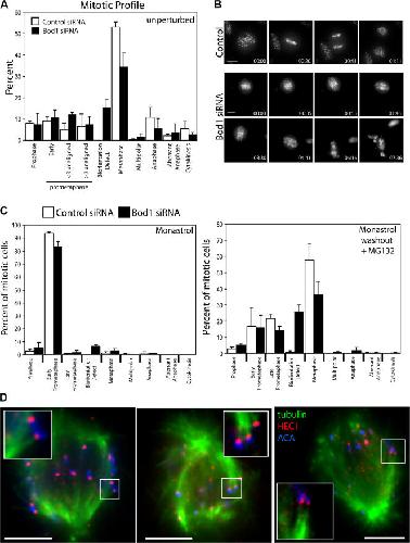 Figure 4. Bod1 is required for the efficient resolution of syntelic attachments. (A) The mitotic profile of control and Bod1-depleted cells was determined 72 h after transfection of siRNA. (B) GFP–CENP-B–transfected HeLa cells were cotransfected with control or Bod1 siRNA, and time-lapse microscopy was performed 72 h after transfection. Projections of selected time points are shown. (C) Control or Bod1 siRNA HeLa cells were treated with monastrol for 3 h, washed, and released into media containing MG132 for 1 h before fixing. The mitotic profile before and after monastrol release is shown. (D) Syntelic attachments in Bod1 siRNA cells 1 h after release from monastrol showing microtubules (green), anti-Hec1 (red), and ACA (blue). Insets are magnified images of boxed areas. Error bars represent SD. Bars, 5 μm.