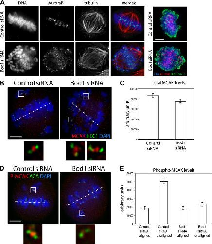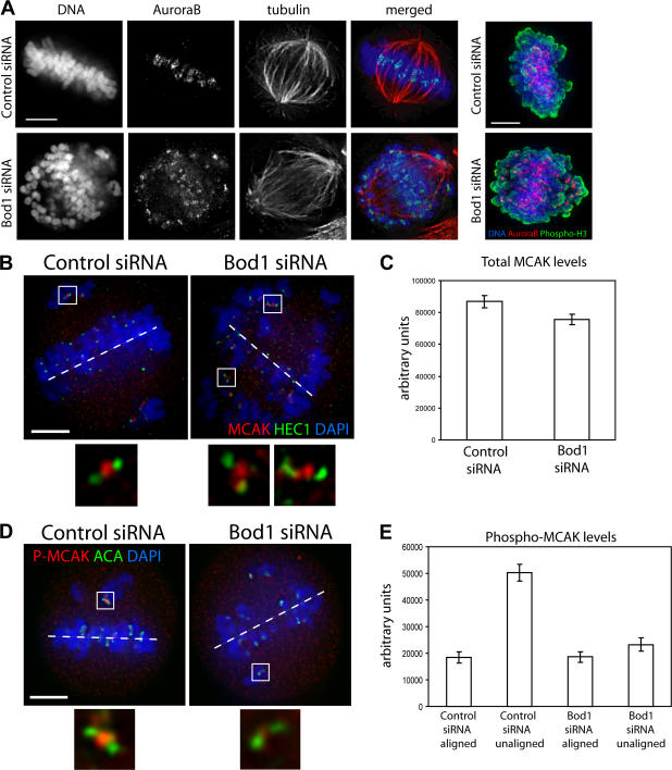 Figure 5. MCAK is not efficiently phosphorylated in Bod1siRNA cells. (A) Aurora B is not delocalized in Bod1-depleted cells. Phospho-Ser10-histone H3 staining in control and Bod1 siRNA cells indicating Aurora B activity. (B–E) Cells were transfected with control or Bod1 siRNA. After 72 h, cells were treated with monastrol for 3 h and released into media containing MG132 for 1 h before fixing. (B and C) Cells were stained for total MCAK population, and levels at kinetochores were quantified. Boxed areas are magnified below the main images. (D and E) Cells were stained for phospho-Ser92-MCAK, and levels at aligned and unaligned kinetochores were quantified. Dashed lines indicate orientation of the metaphase plate. Error bars represent SD. Bars, 5 μm.
