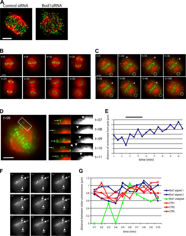 Figure 3. Microtubule and kinetochore dynamics in Bod1-depleted cells. (A) Cold stable microtubule assay of control and Bod1-depleted cells. Microtubules are shown in red, and ACA is shown in green. (B–D) Cells were imaged by transiently transfecting either control or Bod1 siRNA, mCherry-tubulin (red), and GFP–CENP-B (green). Imaging was started 72 h after transfection. (B) Projections of selected time points from a cell transfected with control siRNA are shown. Time from the onset of imaging is shown in the top left corner. (C) Cells transfected with Bod1 siRNA failed to align many of their chromosomes. Arrowheads highlight unaligned kinetochores becoming bioriented. Circles highlight pairs of sister kinetochores that remain behind the spindle pole. (D) Bod1-depleted cell showing unaligned sister kinetochores (boxed area). (right) Oscillation of sister kinetochores over 4 min. Black and white panels show saturated images of tubulin staining to highlight microtubules. Arrows show single oscillating kinetochore pairs; arrowheads show oscillating microtubules. (E) The distance between the sister kinetochores highlighted in D and the centrosome were plotted over time. The black bar highlights the measurements taken from images in D. (F) Selected time points from a Bod1-depleted cell showing CENP-B–GFP. (G) The distance between kinetochores in the unaligned sisters (green line; “un” arrowheads in F) and aligned sisters (aligned 1 and aligned 2, blue lines; a1 and a2 arrowheads in F) depicted in F were measured over time. The distance between three selected sister kinetochore pairs from control cells were also measured over time (red lines). Bars, 10 μm.
