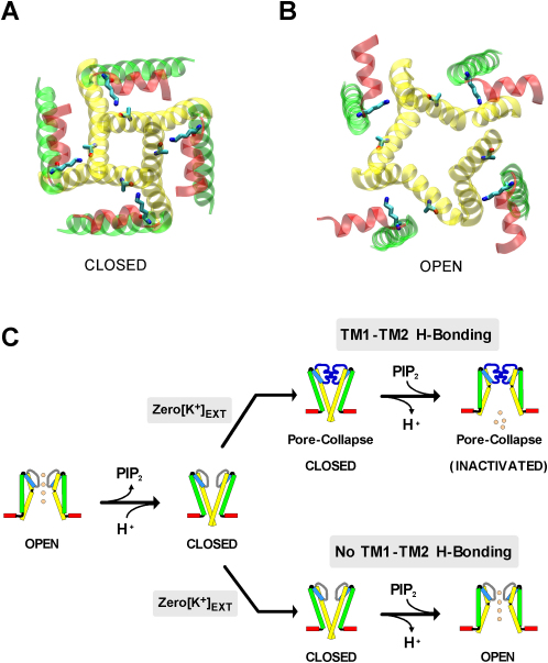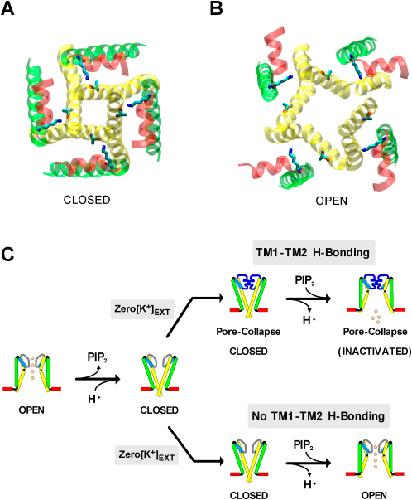 H bonding at the helix-bundle crossing controls gating in Kir potassium channels.