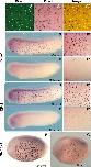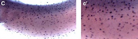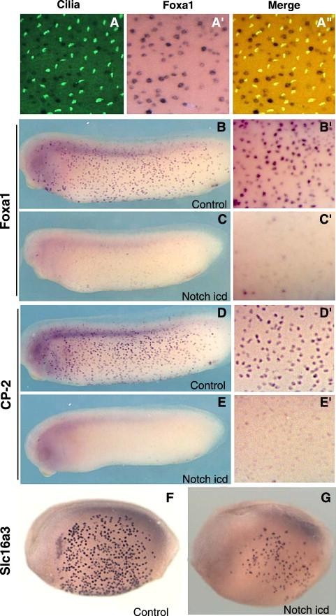 Fig. 6. Small, scattered cells are negative regulated by Notch. In situ hybridization shows that genes expressed in scattered cells do not colocalize with cilia (AâAâ²). Foxa1and CP2 are expressed throughout the embryo at tadpole stages (B, D). The uneven distribution of the cells is seen at higher magnification (Bâ², Dâ²). Injection of Notchicd reduces expression of scattered cell markers in Foxa1(C, Câ²) and CP2 (E, Eâ²). Slc16a3 marks scattered cells early in development (F) and its expression is also reduced by Notchicd (G).