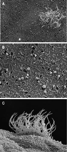 Fig. 2. Ultrastructure of the Xenopus epidermis. (A) View of mucociliary epithelium including a ciliated cell, small secretory cell (marked by â) and several large goblet cells. (B) Goblet cells contain empty vesicles, noted with arrowheads, and vesicles with secretory granules being exocytosed. (C) Lateral view of a ciliated cell, showing the many motile, apical cilia.
