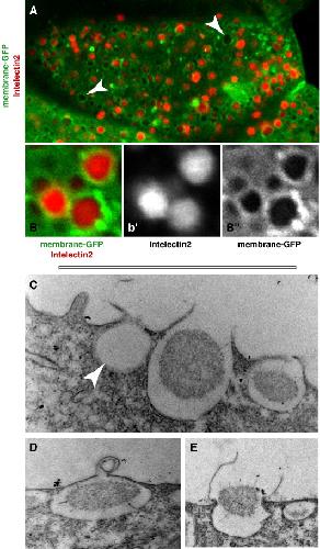 Fig. 4. Goblet cells in the Xenopus epidermis secrete Intelectin-2. (A) A Xenopus epidermis goblet cell; membrane-GFP (green) reveals the extensive exocytic vesicles; antibody staining demonstrates the presence of intelectin-2 (red) in these vesicles. Arrows mark vesicles absent of intelectin-2. (BâBâ²) High magnification of exocytic vesicles shown in panel A. (CâE) Transmission electron microscopy of a Xenopus epidermis goblet cell. (C) Three apically located vesicles at different stages of exocytosis are visible in an epidermal goblet cell. A mucus granule can be seen in the process of being secreted. (D) Membrane fusion intermediate during exocytosis. (E) Exocytic release.