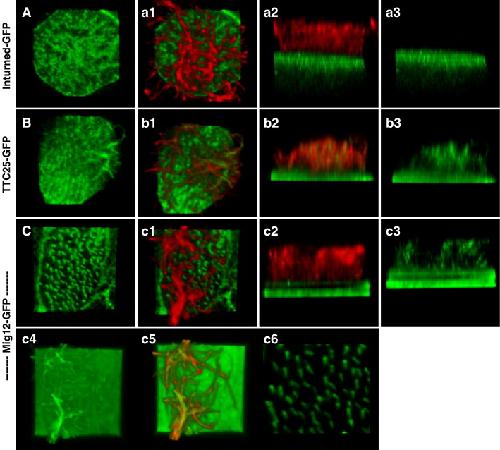 Fig. 7. Mig12 and TTC25 localize to basal bodies and ciliary axoneme. Inturned-GFP, shown here as a reference, is localized at the apical surface of the ciliated cell, but is not in the ciliary axoneme (Aâa3). TTC25-GFP localizes to apical foci, presumably basal bodies, and also to the ciliary axoneme (Bâb3). Mig12-GFP localizes to both basal bodies and the ciliary axoneme (Câc3). At normal gain levels, Mig12-GFP localizes very specifically to the basal bodies (C), clearly marking basal body orientation and ciliary polarity (c6). At high gain levels, the presence of Mig12-GFP in the ciliary axoneme is more apparent (c4âc5).