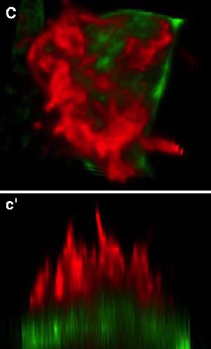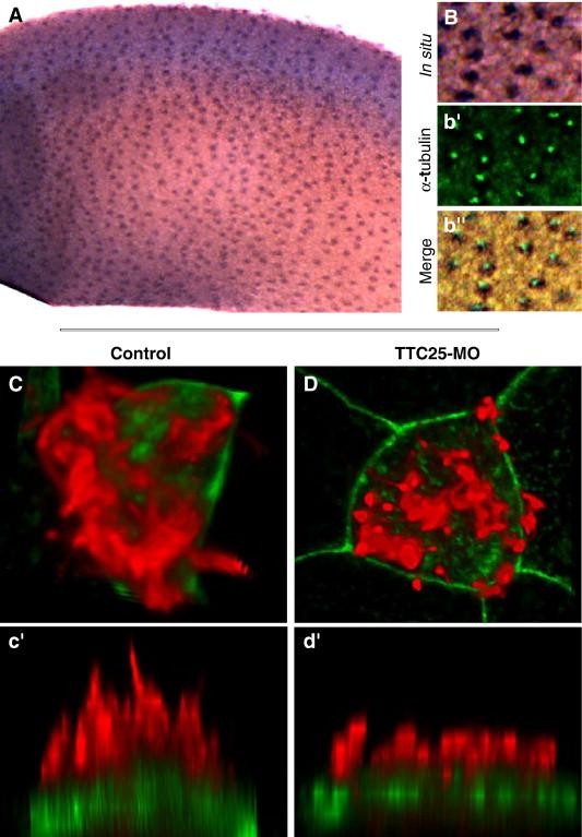 Fig. 8. TTC25 is required for ciliogenesis. (A) TTC25 is expressed in the evenly distributed pattern of ciliated cells, and colocalizes with cilia (Bâbâ²). (C) Ciliated cells in normal embryos develop dozens of long, thin cilia (red, anti-α-tubulin staining). (câ²) Side view of cell shown in panel A. (D, dâ²) Ciliated cells in embryos injected with TTC25 MO develop only short, fat cilia. Such diminutive cilia have also been observed in embryos mutant for IFT proteins (Huangfu and Anderson, 2005).