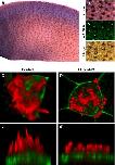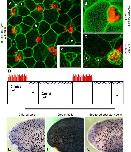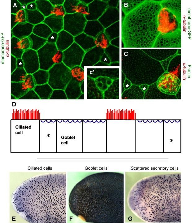 Fig. 1. A screen for differentially expressed genes in a mucociliary epithelium. (A) The Xenopus epidermis is a salt-and-pepper mix of mucus-secreting goblet cells and ciliated cells. Ciliated cells are marked by red α-tubulin staining. Small secretory cells are labeled with an asterisk. All other cells are goblet cells. (B) At higher magnification, membrane-GFP (green) reveals numerous exocytic vesicles at the apical surface of goblet cells, and α-tubulin staining (red) reveals cilia. (C) The vesicles of small secretory cells are shown by phalloidin stain (green) and a neighboring ciliated cell is marked by alpha-tubulin stain (red). (câ²) A high magnification view of a small secretory cell shows visible vesicles. (D) A diagram of cell types in the Xenopus epidermis. Goblet cells are the predominant cell type. Ciliated and small secretory cells (asterisks) are scattered throughout. (E) In situ hybridization for genes expressed in ciliated cells produces regularly spaced dark spots on a light background. (F) Genes expressed in goblet cells produce a reciprocal pattern. (G) Small secretory cells are visible as unevenly scattered dark spots. The full set of differentially expressed genes can be found in Supplemental Table 1.