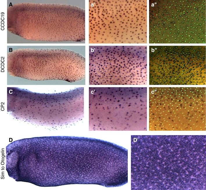 Fig. 3. Representative expression patterns from screen. Expression of coiled-coil domain containing 19, (A) and Doublecortin domain-containing 2 (B) in ciliated cells are evenly spaced and colocalize with α-tubulin marking cilia. (C) The transcription factor CP2 is expressed in the scattered secretory cells, and its expression does not colocalize with cilia. (D) Similar to Otogelin is expressed in mucus-secreting goblet cells covering much of the epidermis. High magnification view reveals absence of expression in scattered secretory and ciliated cells.