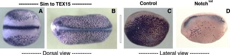 Fig. 5. TEX15, a ciliated cell marker is expressed in presumptive ciliated cells and other ciliated tissues and is negatively regulated early on by Notch. TEX15 is expressed in ciliated tissues such as the midline (A) and the future ear (B). Expression in presumptive ciliated cells in early development (C) is severely reduced by Notch-icd (D).