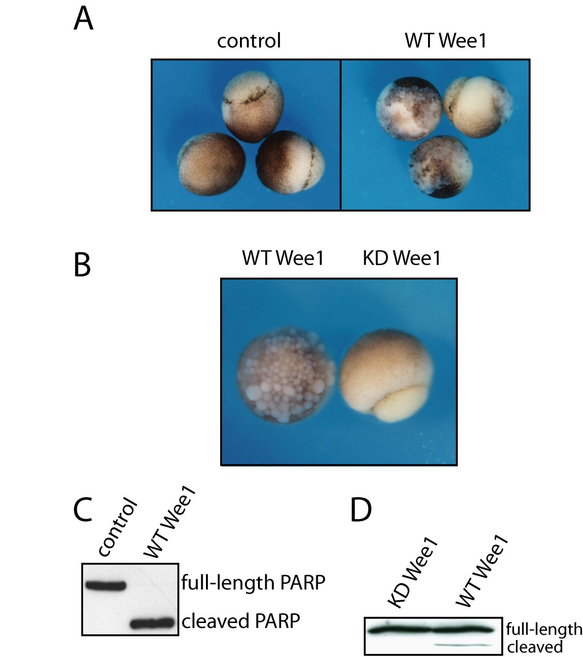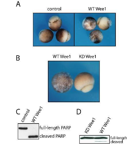 Figure 2. Overexpression of Wee1 in early Xenopus embryos triggers apoptosis after the MBT. One-cell stage Xenopus embryos were microinjected with 2.5 ng wild-type (WT) Wee1, kinase-dead (KD) Wee1, or luciferase (control) mRNA. (A-B) Embryos expressing Wee1, KDWee1, and luciferase developed normally until the early gastrula stage, when embryos expressing exogenous WT Wee1 exhibited abnormal morphology consistent with apoptosis. Embryos shown were photographed at gastrulation (Stage 11). (C-D) Embryo extracts were collected at Stage 11 and incubated with recombinant human PARP, a substrate for caspase 3 [4]. The presence of a cleaved PARP fragment indicates caspase activity, a marker of apoptosis.
