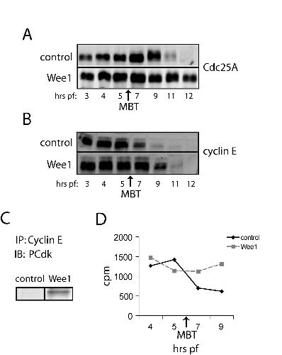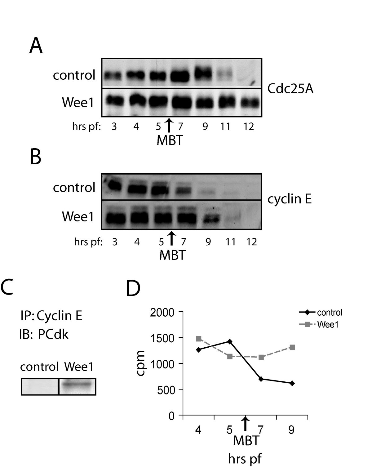 Figure 3. Overexpression of Wee1 delays the MBT and alters Cdk2. Embryos were injected at the one-cell stage with 2.5 ng of Wee1 or luciferase (control) mRNA. (A, B) Embryos were collected at the indicated stages and lysates were subjected to Western analysis using (A) Cdc25A and (B) cyclin E antibodies. Approximate timing of the MBT in luciferase expressing control embryos is indicated. (C) Embryos were collected at 4 hrs pf and lysates were immunoprecipitated with cyclin E serum. Immunoprecipitates were subjected to Western analysis using a primary phosphoCdk antibody (Cell Signaling Technology). (D) Cyclin E immunoprecipitates were collected at the times indicated and assayed for Cdk2 activity by phosphoryation of histone H1. The amount of γ-32P ATP incorporated in histone H1 is expressed as radioactive counts per minute (CPM).