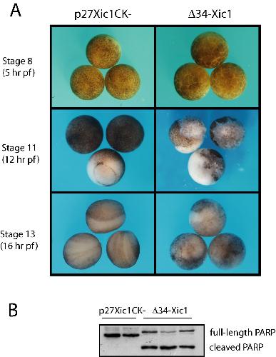 Figure 4. Inhibition of Cdk2 triggers apoptosis. One-cell stage embryos were injected with 5 ng of δ34-Xic1 or p27Xic1CK- (control) protein. (A) Embryos expressing δ34-Xic1 were delayed approximately one cell cycle at Stage 8 (5 hr pf) compared to p27Xic1CK- controls. At Stage 11 (12 hr pf), embryos expressing δ34-Xic1 exhibited abnormal morphology consistent with apoptosis compared to p27Xic1CK- controls, which gastrulated. p27Xic1CK- controls continued to develop through gastrulation and formed a neural groove, evident at Stage 13 (16 hr pf). (B) Extracts of Stage 11 embryos were incubated with recombinant PARP, a substrate for caspase 3 [4]. The presence of a cleaved PARP fragment indicates caspase activity. Replicate samples are shown.