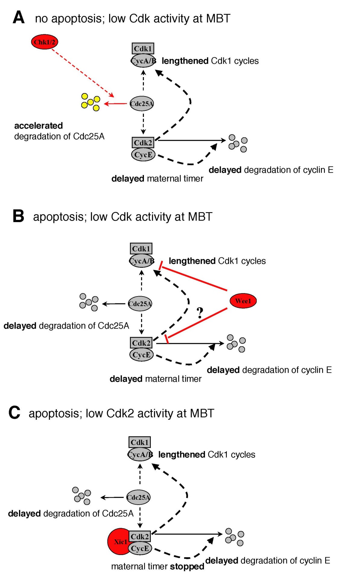 Figure 5. Effects of inhibitors of Cdk activity on early development of X. laevis. (A) Exogenous Chk1/2 indirectly inhibits Cdk1 and Cdk2 by targeting Cdc25A for degradation. Onset of the MBT is delayed, but development proceeds without apoptosis. (B) Exogenous Wee1 phosphorylates Cdk1 and Cdk2. The total pool of Cdk1 activity is inhibited. Onset of the MBT including degradation of Cdc25A is delayed. Embryos die by apoptosis during early gastrulation. (C) Exogenous δ34-Xic1 inhibits Cdk2 but not Cdk1. Like Wee1, δ34-Xic1 delays the MBT including degradation of Cdc25A, and induces apoptosis.