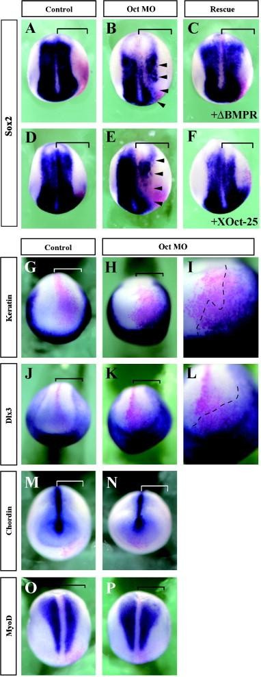 Fig. 4. Perturbation of XOct-25 function in the ectoderm during embryogenesis. The phenotypes of neurula stage embryos coinjected with either Oct MO or 6-mismatch control MO together with β-gal mRNA into one of the dorsal animal blastomeres at the 8-cell stage. The amounts of injected antisense oligonucleotides per embryo were 5.6 ng (AâC) and 4.3 ng (GâP) for moderate amounts, and 8.6 ng (DâF) as a large amount. The reduction of Sox2 expression by Oct MO injection was rescued by coinjection of δBMPR mRNA (500 pg, C) or GR-mutXOct-25 mRNA (250 pg, F). Note that cells receiving Oct MO expressed the epidermal markers epidermal keratin and Dlx3 at the expense of the neural marker Sox2 (B, H, I, K and L). There was no effect on the expression of the mesodermal markers chordin and MyoD by XOct-25 knockdown (N and P). The expression of marker genes is shown in purple. β-gal was stained in red and the injected side of the embryo is indicated by brackets. I and L are magnifications of H and K, respectively. The edges of ectopic epidermal marker expression are indicated by dashed lines (I and L). AâF, O and P: dorsal view; GâL and N: frontal view; M: dorso-frontal view.