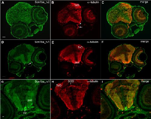 Figure 6. Zebrafish Scn1ba_tv1 and Scn1ba_tv2 are expressed in brain. A – C. Anti-Scn1ba_tv2 (green), anti-acetylated α-tubulin (red). Arrow: optic nerve. Arrowhead: optic chiasm. Anti-Scn1ba_tv2 does not stain the optic nerve or optic chiasm. Scale bar: 20 μm. D – F. Anti-Scn1ba_tv1 (green), anti-acetylated α-tubulin (red). Scn1ba_tv1 staining appears in the optic tectum (TeO), post optic commissure (poc), and optic nerve (arrow). G – I. Anti-Scn1ba_tv1 (green), anti-acetylated α-tubulin (red). Scn1ba_tv1 staining appears in the poc and TeO as well as in the rostral hypothalamus (Hr), but is absent in the subcommisural organ (SCO).