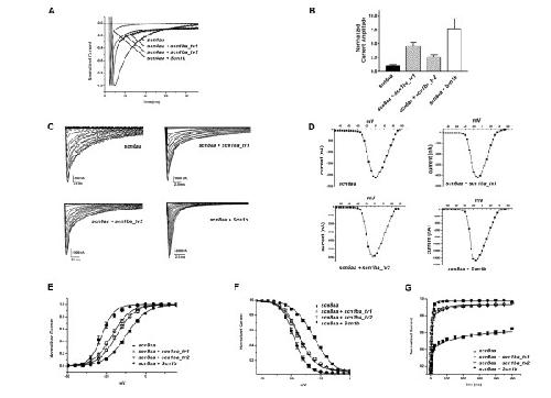 Figure 11. Zebrafish β1 subunits modulate scn8aa. A. Normalized Current Traces. Effects of rat and zebrafish β subunits on current time course. Each trace shows the mean current elicited by depolarization to 0 mV from a holding potential of -80 mV in oocytes injected with the indicated combinations of α and β subunits. B. Current Density. Coexpression of scn1ba_tv1, scn1ba_tv2, or Scn1b cRNA with scn8aa cRNA results in increased current amplitude compared to α alone. Individual peak current amplitudes for each condition were measured and normalized to the mean current amplitude of scn8aa for each experiment to account for variability between different oocyte preparations. C. Representative Na+ current traces for scn8aa alone (upper left), scn8aa plus scn1ba_tv1 (upper right), scn8aa plus scn1ba_tv2 (lower left), and scn8aa plus Scn1b (lower right) D. Current-voltage relationships for the families of Na+ currents shown in panel C. E. Voltage dependence of activation. Coexpression of scn8aa with Scn1b (●), scn1ba_tv1 (△), or scn1ba_tv2 (▽) results in hyperpolarizing shifts in the voltage dependence of activation compared to the expression of scn8aa alone (■). Coexpression of scn8aa with scn1ba_tv1 results in a significantly greater hyperpolarizing shift than coexpression with scn1ba_tv2. F. Voltage dependence of inactivation. Coexpression of scn8aa with Scn1b, scn1ba_tv1, or scn1ba_tv2 resulted in hyperpolarizing shifts in the voltage dependence of inactivation compared to scna8a alone. The effects of scn1ba_tv1 and scn1ba_tv2 on the voltage-dependence of inactivation are indistinguishable from each other. G. Zebrafish β subunits speed recovery from inactivation. Coexpression of scn8aa with Scn1b (●), scn1ba_tv1 (△), or scn1ba_tv2 (▽) results in a dramatic increase in the rate of recovery from inactivation compared with scn8aa alone (■). Zebrafish scn8aa (■) expressed alone has a very slow rate of recovery, and a full recovery was never achieved during the duration of the experiment.