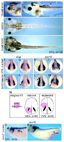 Fig. 2. Krm2 overexpression induces NC-derived structures and NC markers in Xenopus. (A-E) Phenotypic analysis of krm2 overexpression. Anterior to the left. (A-C) Embryos at the 16-cell stage were injected in a single animal (A,B) or ventral equatorial (C) blastomere with 400 pg krm2 mRNA and photographed at tadpole stages. Arrowheads indicate ectopic pigment-containing structures. (D) Uninjected control embryo at tadpole stage. (E) Embryos at the four-cell stage were injected equatorially in both dorsal blastomeres with 400 pg krm2 mRNA each. (F-M) Neurula stage embryos, shown in anterior view. Embryos were injected with 400 pg PPL (F-I) or krm2 (J-M) mRNA into one ventral equatorial blastomere at the 16-cell stage (F,H,J,L) or one dorsal animal blastomere at the 8-16-cell stage (G,I,K,M). In situ hybridizations were performed using slug and sox10 probes as indicated.β -gal lineage tracer is stained in red. Circles indicate lineage-tracer-positive cells. Black and white arrowheads indicate altered and control marker gene expression, respectively. (N) Scheme and statistical overview of experiment shown in F-M. Red area indicates region of krm2-injected cells. (O,P) Embryos were injected as in C and sox10 expression was analyzed at tailbud stage by whole-mount in situ hybridization. Arrowheads indicate ectopic sox10 expression. Co-injected lacZ was used as lineage tracer (red).