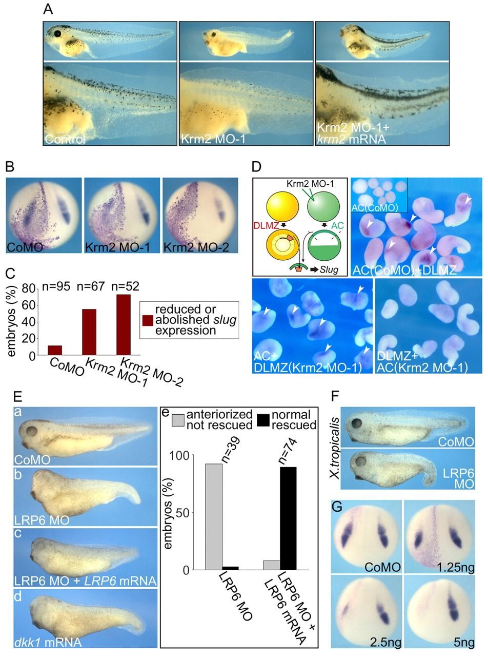 Fig. 3. Krm2 and LRP6 are required for NC induction in Xenopus. (A-D) Morpholino-mediated knockdown of krm2 expression. (A) Embryos at the eight-cell stage were injected animally with 10 ng Krm2 MO-1 plus either 0.8 ng PPL (middle panel) or V5-Xkrm2 mRNA (right panel), respectively. Control, PPL mRNA injected. Normal or hyper-pigmentation was observed in 9% (n=35) of (Krm2 MO-1 + PPL) and in 44% (n=27) of (Krm2 MO-1 + V5-Xkrm2) mRNA injected embryos, respectively. (B) Embryos at the eight-cell stage were injected animally with 10 ng Krm2 MO-1 or 20 ng Krm2 MO-2 or control MO (CoMO), respectively. Shown are whole-mount in situ hybridizations for slug expression at neurula stage in anterior view. β-gal lineage tracer is stained in red. (C) Statistical overview of MO injection experiment in B. (D) Top left: diagram of experiment. Two-cell-stage embryos were injected animally with 7.5 ng CoMO or Krm2 MO-1, and animal caps (ACs) were explanted at stage 8-9 and combined with dorsolateral marginal zones (DLMZs) of uninjected or Krm2 MO-1 (7.5 ng) injected gastrula-stage embryos. Conjugates were assayed at stage 20 for slug expression by in situ hybridization. Top right: conjugates of DLMZs and CoMO-injected caps. Arrowheads indicate slug expression. Inset: ACs injected with CoMO and processed for slug expression. Bottom left: conjugates of ACs and Krm2 MO-1 injected DLMZs. Arrowheads indicate slug expression. Bottom right: conjugates of DLMZs and Krm2 MO-1 injected ACs. (E,F) Phenotypic analysis of LRP6 MO in X. laevis (E) and X. tropicalis (F). All embryos were injected equatorially at the two-cell stage. (E) (a) Injection of 5 ng CoMO. (b,c) Co-injection of 5 ng LRP6 MO and either 1 ng control (PPL) (b) or 400-600 pg human LRP6 mRNA (c). (e) Statistical overview of a-c. (d) Injection of 20 pg dkk1 mRNA. (F) Xenopus tropicalis embryos injected with 1.25 ng CoMO or LRP6 MO show the displayed phenotypes at frequencies of 89%, n=38, upper panel and 98%, n=44, lower panel. (G) Two-cell-stage X. laevis embryos were injected equatorially in one blastomere with 5 ng CoMO or increasing LRP6 MO doses as indicated. Neurula stage embryos were processed for slug expression by in situ hybridization and are shown in anterior view. β-gal lineage tracer is stained in red.