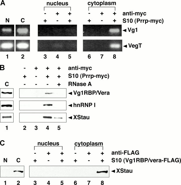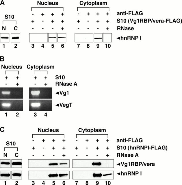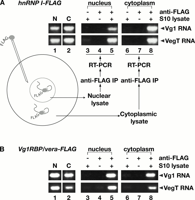 Cytoplasmic localization of mRNAs is a widespread mechanism for generating cell polarity and can provide the basis for patterning during embryonic development. A prominent example of this is localization of maternal mRNAs in Xenopus oocytes, a process requiring recognition of essential RNA sequences by protein components of the localization machinery. However, it is not yet clear how and when such protein factors associate with localized RNAs to carry out RNA transport. To trace the RNA-protein interactions that mediate RNA localization, we analyzed RNP complexes from the nucleus and cytoplasm. We find that an early step in the localization pathway is recognition of localized RNAs by specific RNA-binding proteins in the nucleus. After transport into the cytoplasm, the RNP complex is remodeled and additional transport factors are recruited. These results suggest that cytoplasmic RNA localization initiates in the nucleus and that binding of specific RNA-binding proteins in the nucleus may act to target RNAs to their appropriate destinations in the cytoplasm.