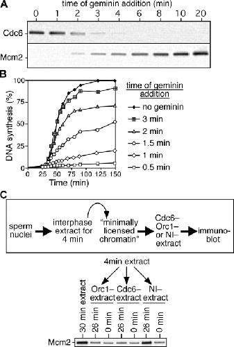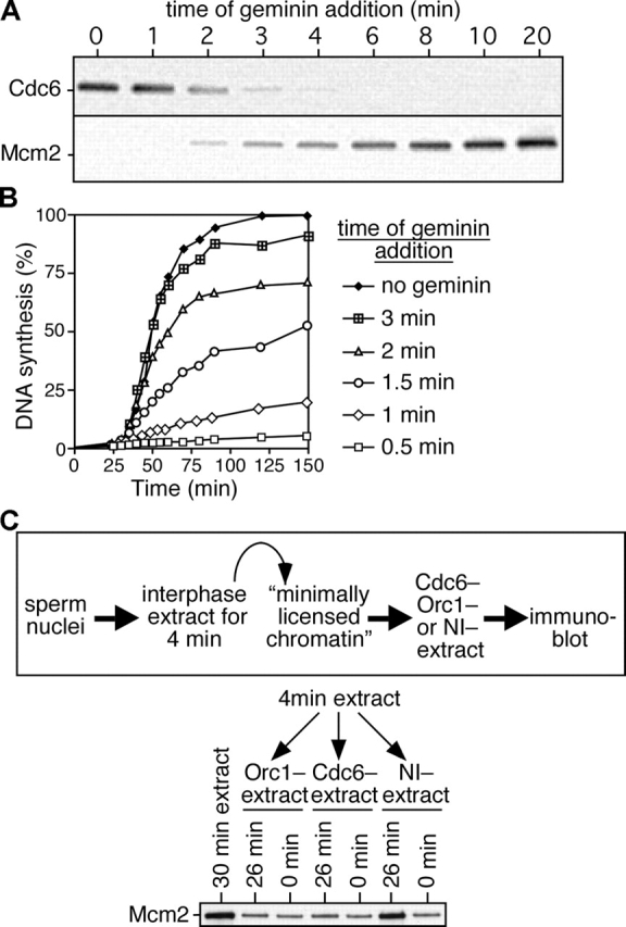 Figure 3. Cdc6 is destabilized on chromatin after the minimal effective quantity of Mcm2-7 is loaded. (A and B) Sperm nuclei were incubated at 10 ng DNA/μl in interphase egg extract, and gemininDEL was added at the indicated times after sperm addition. (A) Chromatin was isolated 5 min after gemininDEL addition and immunoblotted for Cdc6 and Mcm2. (B) DNA synthesis was assayed by α-[32P]dATP incorporation. (C) Sperm nuclei were incubated in interphase egg extract for 4 min; chromatin was isolated and incubated for an additional 0 or 26 min in extract previously immunodepleted of ORC or Cdc6 or mock depleted with nonimmune antibodies (NI−). Chromatin was isolated and immunoblotted for Mcm2. Chromatin isolated after a 30-min incubation in untreated extract is shown as control. The top shows a schematic diagram of the experimental protocol.