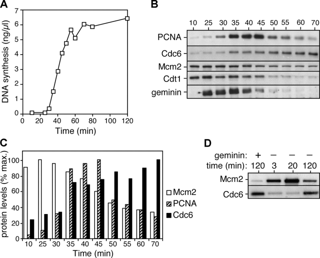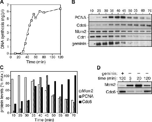 Figure 4. Cdc6 reloading onto chromatin starts at the beginning of S phase. Sperm nuclei were incubated at 7 ng DNA/μl in interphase egg extract. (A) Time course of DNA synthesis. (B and C) Chromatin was isolated at the indicated times and immunoblotted for PCNA, Cdc6, Mcm2, Cdt1, and geminin. The immunoblots are shown in B and quantitation of the intensity of Mcm2, PCNA, and Cdc6 is shown in C. (D) Chromatin from either untreated extract or extract supplemented with geminin was isolated at the indicated times and immunoblotted for Mcm2 and Cdc6.
